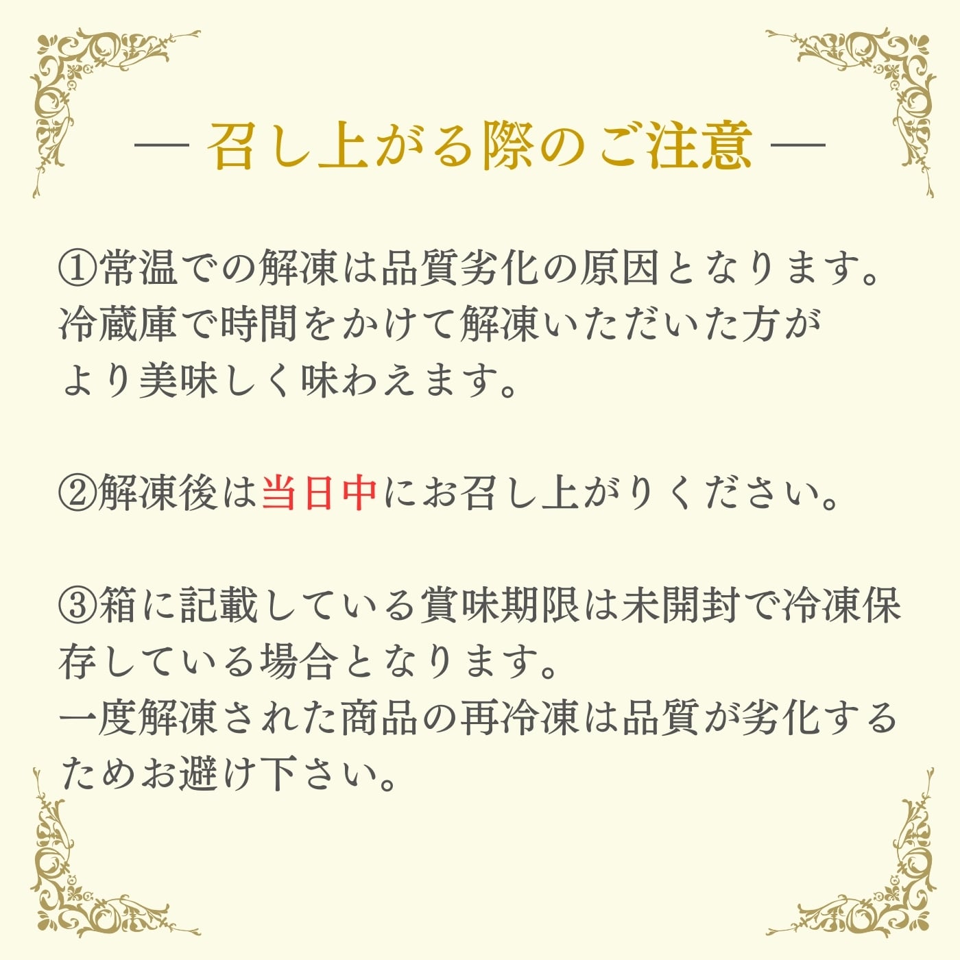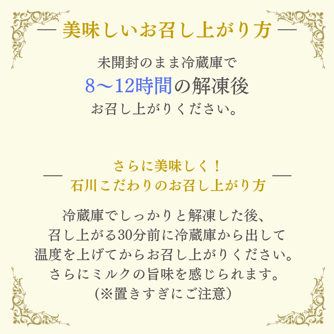 しっかりと解凍した後、室温で30分程置き温度を上げてから召し上がると、ミルキー感や豊かな旨味が存分に味わえます。